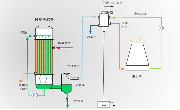 常規(guī)蒸發(fā)中需要大量冷卻水冷卻二次蒸汽的熱量(使之冷凝),然后冷卻水的熱量再通過冷卻塔冷卻將熱量釋放到大氣中,不但消耗新鮮蒸汽,同時冷卻塔消耗大量循環(huán)水以及電能(泵)運行,造成三重浪費。