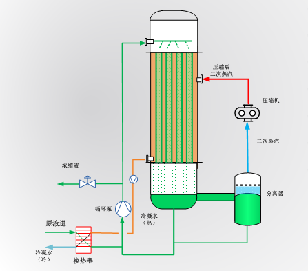 MVR技術(shù)可以將需要冷凝的二次蒸汽通過壓縮再次利用,以替代新鮮蒸汽,不但避免了使用新鮮蒸汽,而且徹底摒棄了冷卻塔,大大降低了運行費用,真正做到了環(huán)保節(jié)能、節(jié)水、節(jié)約費用!